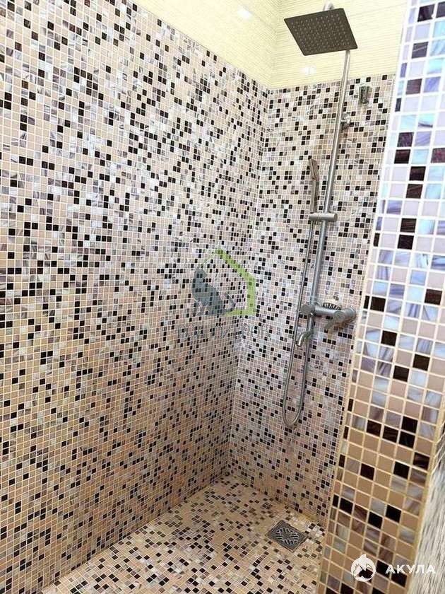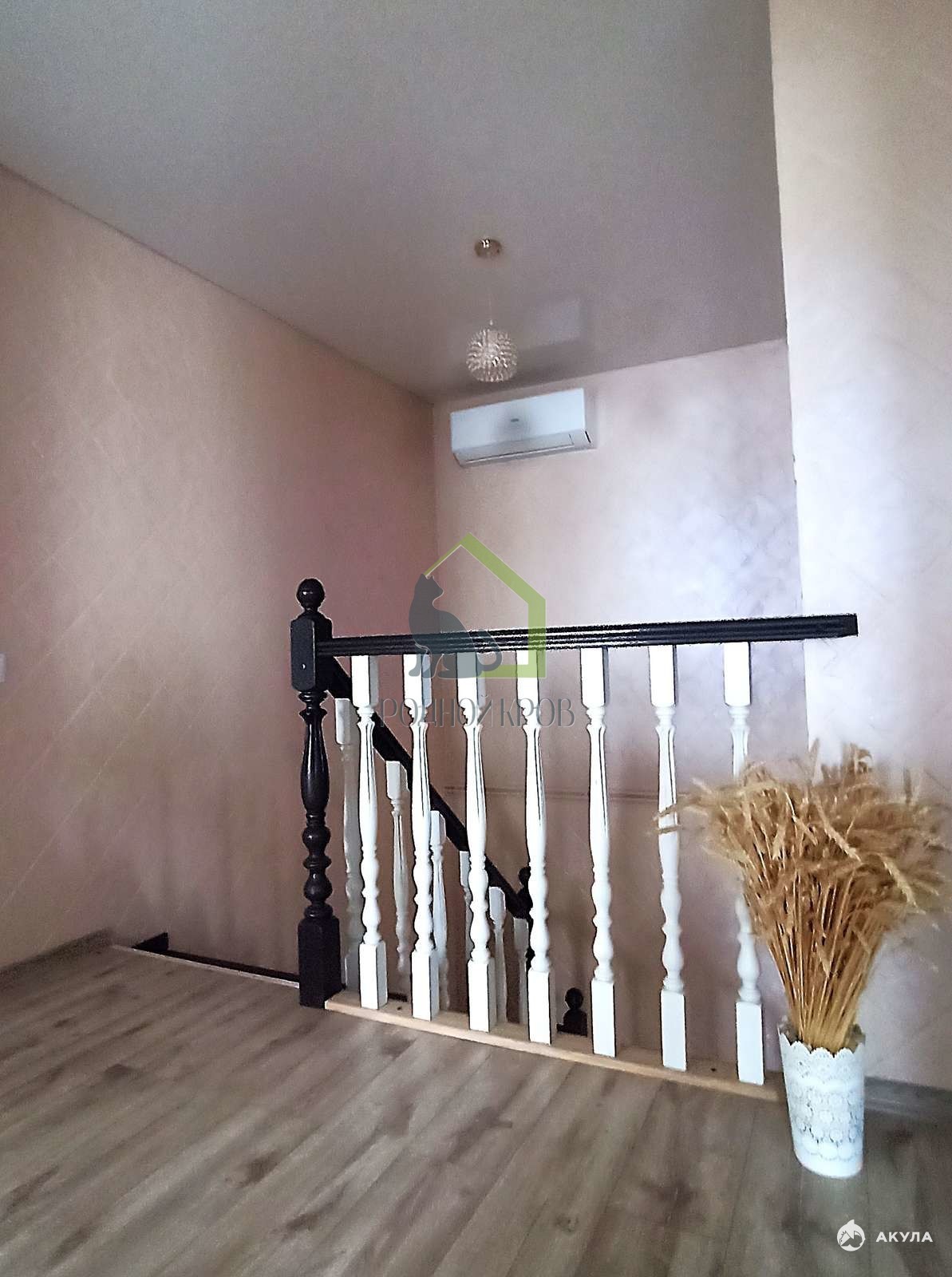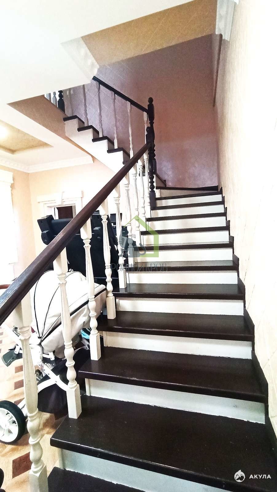 В доме стены отделаны декоративной штукатуркой с элементами декора. Пол на первом этаже –плитка, на втором – ламинат. Крыша – металлочерепица.